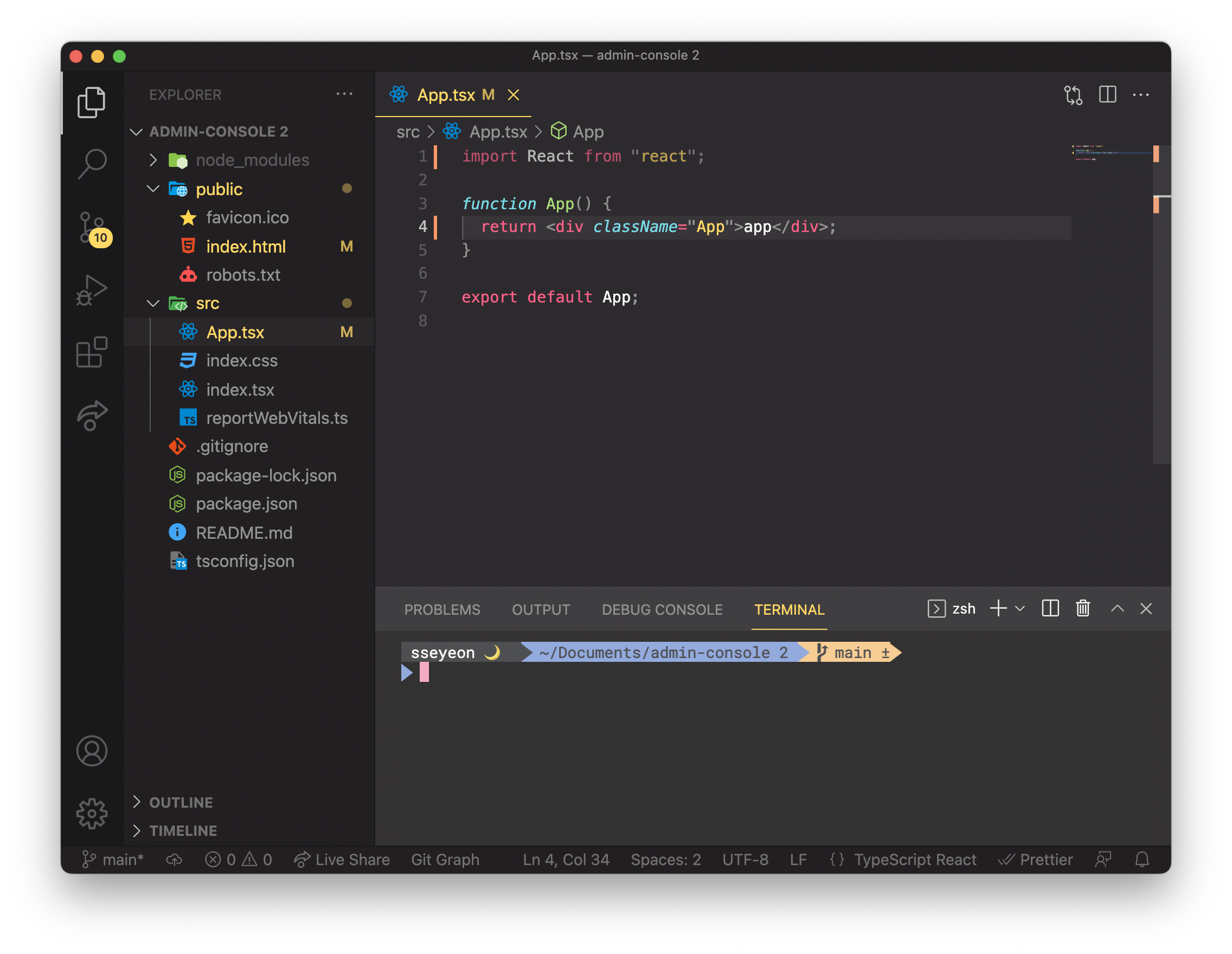 위의 명령어를 이용하여 react를 typescript로 시작한다. 나는 이미 만들어진 폴더 아리애 바로 프로젝트를 생성하기 위해 .을 입력했지만 여기에 원하는 파일명을 입력하면 그 안에 리액트 프로젝트를 시작할 수 있다. 프로젝트 파일이 모두 생성된 후에는 제대로 실행이 되는지 확인한 후에 필요없는 파일들을 전부 다 삭제해주었다.