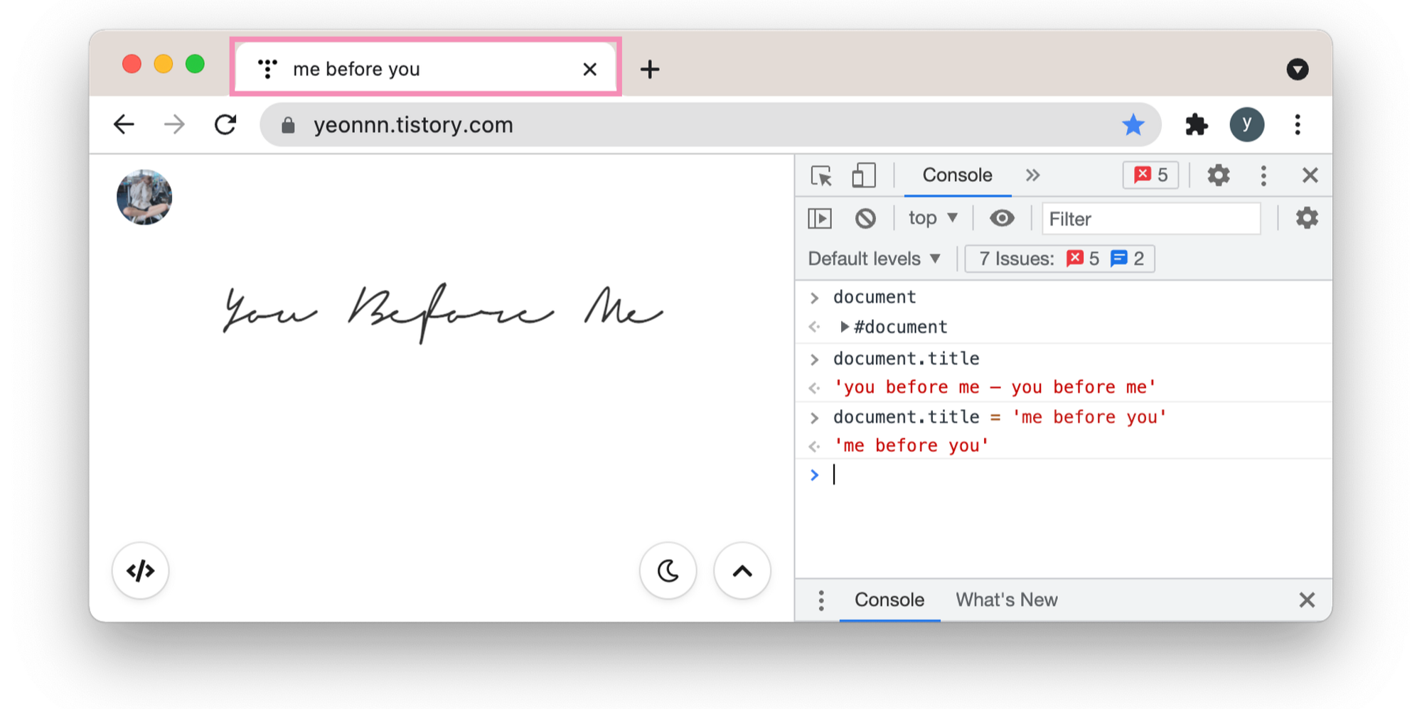 2. console 창에서 다음과 같은 명령어를 통해 title 이름을 바꿀 수 있다.